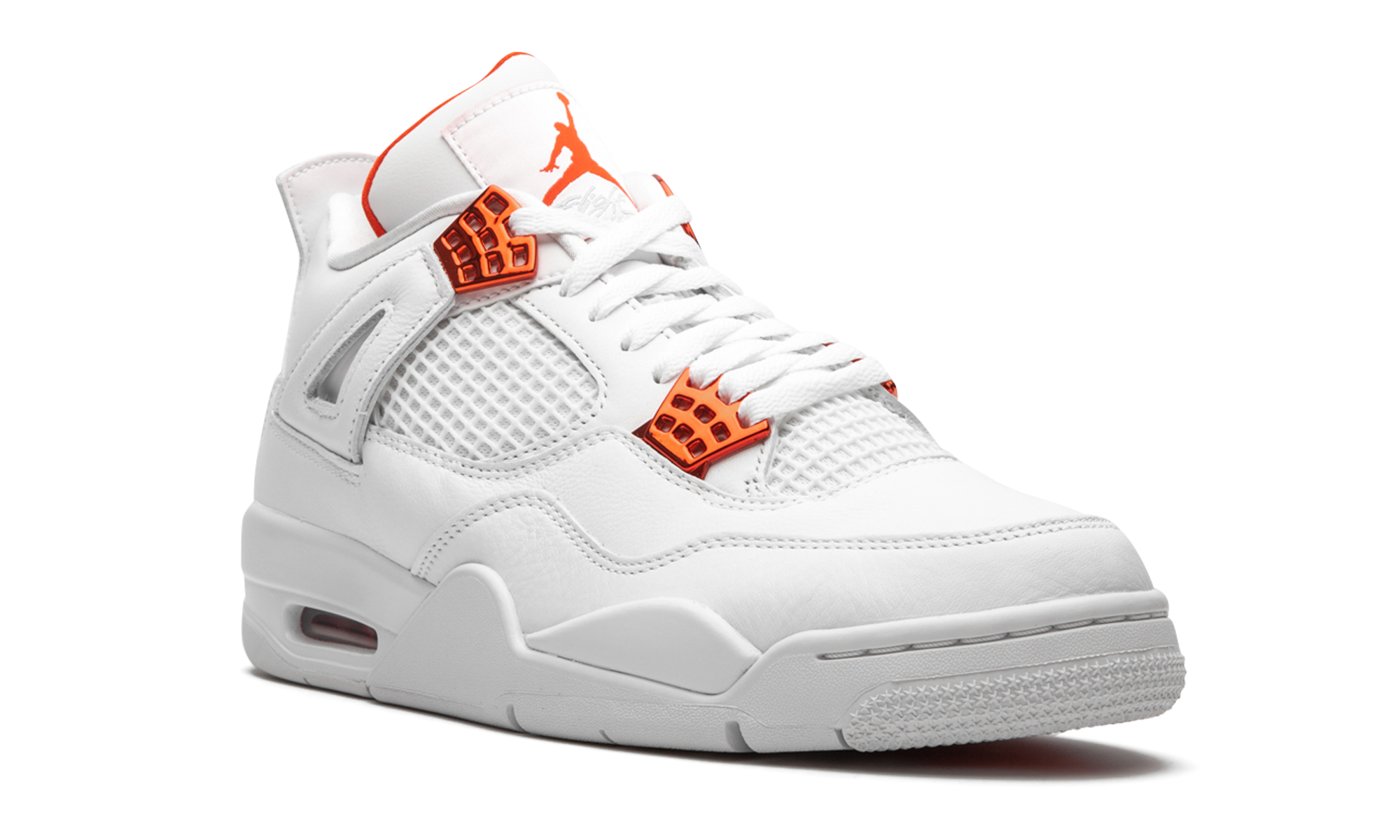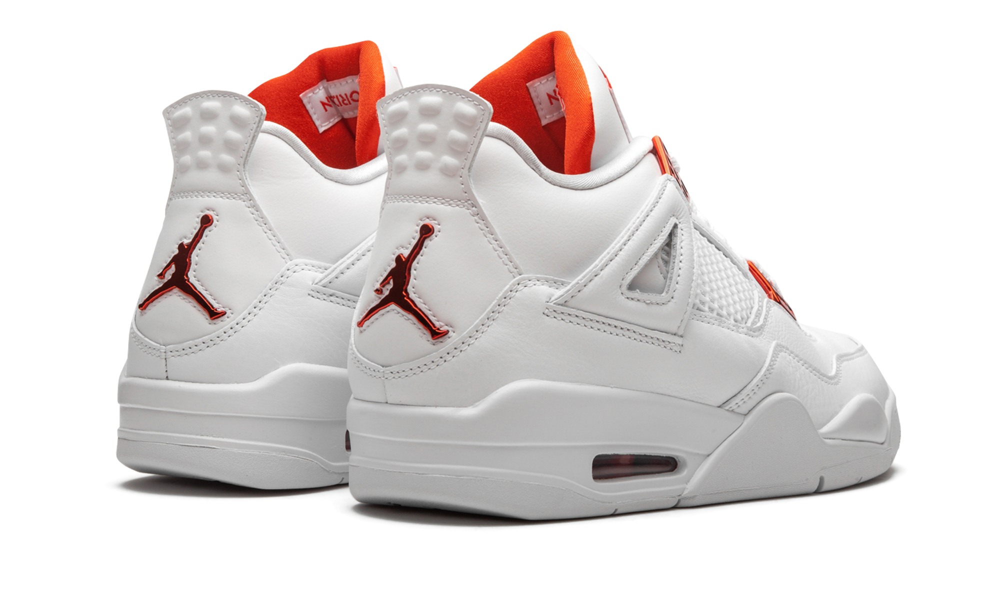 The Air Jordan 4 “Metallic Pack - Orange” is part of Jordan Brand’s 2020 collection of “Metallic” colorways inspired by an original design from the 1980s. One of several “Metallic Pack” Jordan 4s, this “Orange” design is reminiscent of the Air Jordan 1 of the same nickname from 1985, which was an original makeup of Michael Jordan’s first signature shoe. The two-toned appearance features a white leather upper with tonal netting on the mid-panel and throat. Metallic Orange hits on the lace eyelets and Jumpman detailing on the heel provide a stark contrast to the neutral base. Additional orange Jumpman branding can be found on the nylon tongue tab. The hue also appears on the inner lining of the tongue. The classic Air Jordan 4 appearance of this “Metallic Orange” design includes a small visible Air window in the heel. Release date: May 20, 2020. Metallic Pack - Orange
