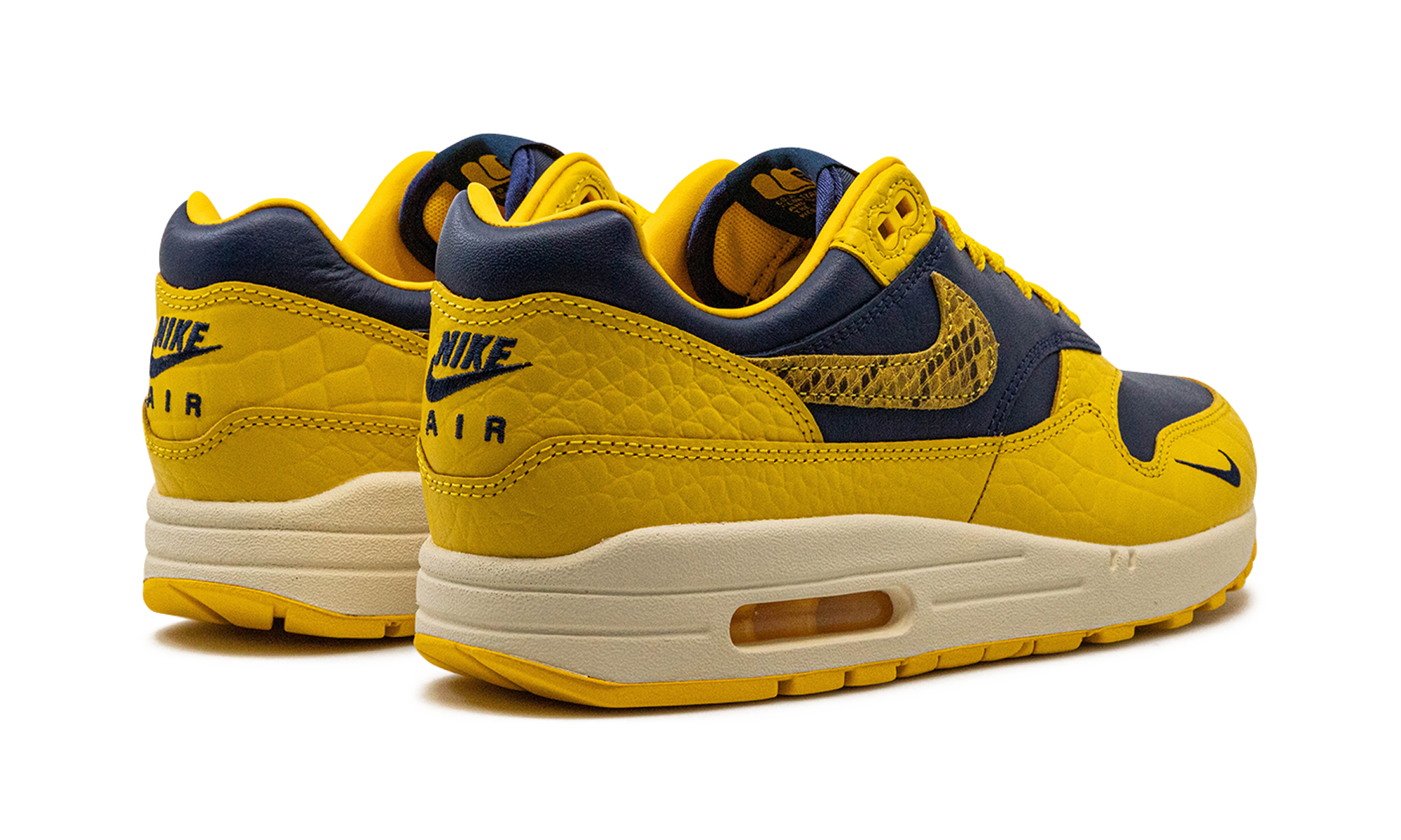 The Women’s Nike Air Max 1 Co.Jp “Michigan Snakeskin” is a women’s-exclusive colorway of the retro running shoe included in Nike’s bringback of the “Concept Japan” collection. The bold “Michigan Snakeskin” colorway features a Midnight Navy leather base with Varsity Maize textured pebbled leather overlays. Yellow reptilian-designed Swooshes appear on the side. Classic “Nike Air Max 1” branding is printed on the tongue and a small navy Swoosh is embroidered on the forefoot. Additional “Nike Air” insignia is embroidered on the heel. Release date: June 21, 2023 Co.jp Head to Head